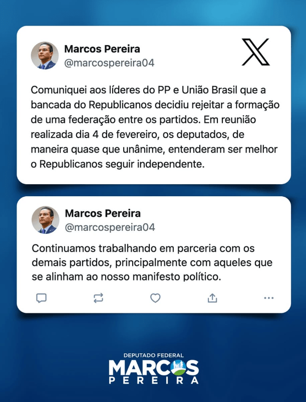 No post, Marcos Pereira disse que a proposta foi descartada quase que por unanimidade após uma reunião com a bancada do Republicanos na Câmara dos Deputados. “Comuniquei aos líderes do PP e União Brasil que a bancada do Republicanos decidiu rejeitar a formação de uma federação entre os partidos. Em reunião realizada dia 4 de fevereiro, os deputados, de maneira quase que unânime, entenderam ser melhor o Republicanos seguir independente”, disse.