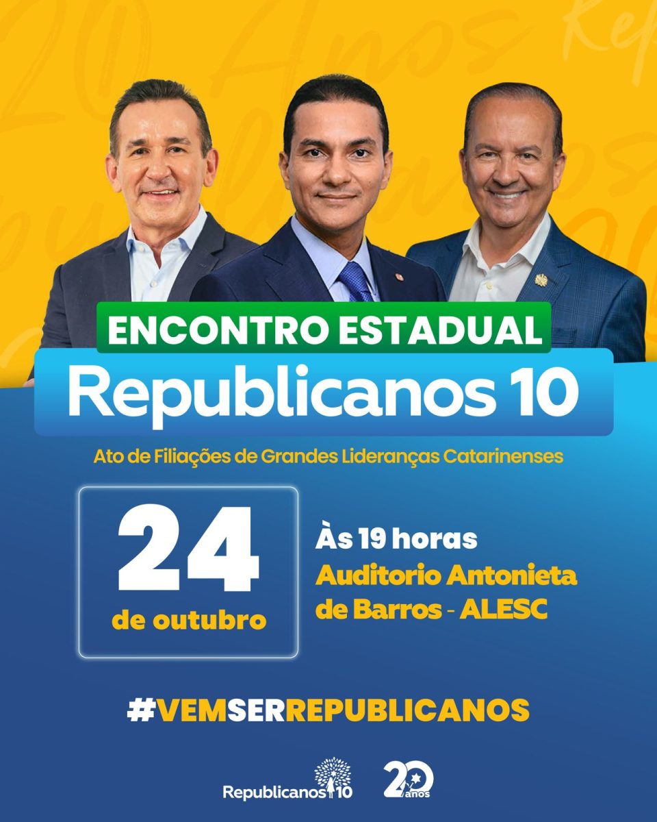 O Republicanos realiza, no próximo dia 24 de outubro, às 19 horas, o Encontro Estadual do Republicanos no Auditório Antonieta de Barros, na Assembleia Legislativa de Santa Catarina, em Florianópolis.