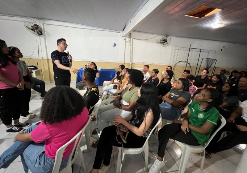 Os jovens presentes receberam papéis e canetas para escrever suas perguntas e curiosidades, que foram recolhidas para discussão. Este momento de interação permitiu que os participantes expressassem suas dúvidas e interesses diretamente aos componentes da mesa, com um foco especial no pré-candidato.