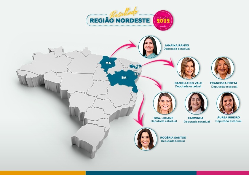 O destaque ficou por conta de Sergipe, que das sete eleitas na região, elegeu 3 republicanas para a assembleia legislativa. São elas: Dra Lidiane Lucena (SE) com 37.332 votos; Carminha (SE) teve 34.790 votos; e Aurea Ribeiro (SE), com 26.200 votos. Todas foram eleitas para um primeiro mandato de deputadas estaduais. Completam a lista: Rogéria Santos (Republicanos-BA) foi eleita com 82.012 votos para um primeiro mandato como deputada federal para a Bahia; Janaína Ramos (MA), eleita com 38.927 votos para o primeiro mandato de deputada estadual no Maranhão; Francisca Motta (PB), com 40.230 votos, e Daniela do Vale (Republicanos-PB), com 37.235 votos, eleitas para a assembleia legislativa na Paraíba.