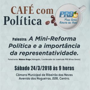 Ribeirão das Neves (MG) – O PRB Ribeirão das Neves, região metropolitana de Belo Horizonte, realiza no dia 24 de março, às 9h, na Câmara de Vereadores, um café com lideranças e a população. A minirreforma política e a importância da representatividade serão os temas do encontro.