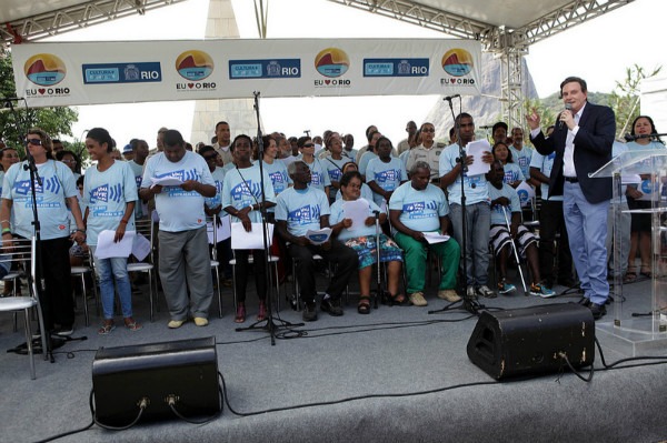Em meio ao clima de descontração, o prefeito Marcelo Crivella (PRB) cantou junto com coral,