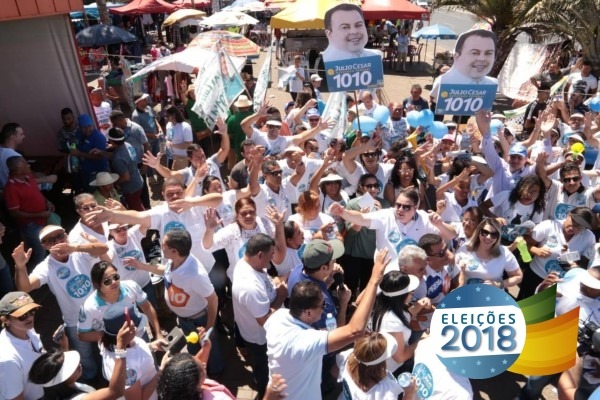 Cercado de militantes com bandeiras e adereços, Julio Cesar percorreu vários comércios locais para corpo